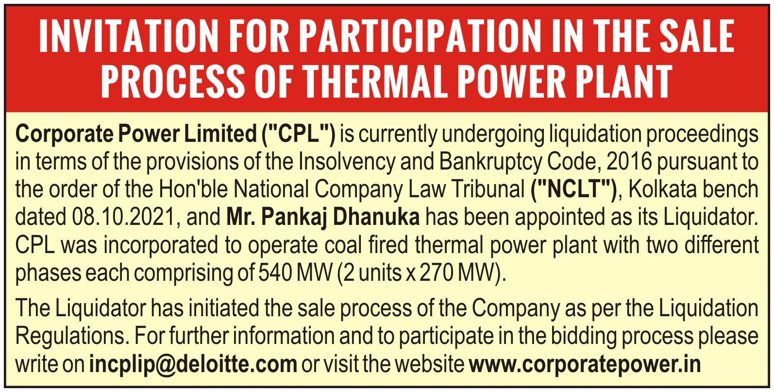 | TIMELINES FOR THIRD E-AUCTION FOR SALE OF CORPORATE DEBTOR AS A GOING CONCERN | View | Download | |