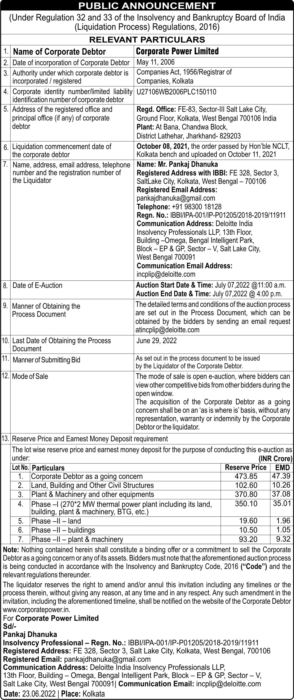 | TIMELINES FOR SECOND E-AUCTION FOR SALE OF CORPORATE DEBTOR AS A GOING CONCERN | View | Download | |